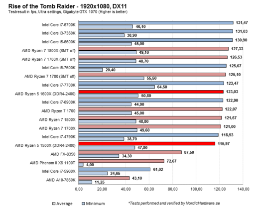 Noterbart är att testresultaten i Rise of the Tomb Raider uppvisar väldigt underliga mönster. Ryzen tappar rejält i låg upplösning med Directx 12 aktiverat medan Intel ser ökad bildfrekvens. Det är oklart exakt vad som ligger bakom de lustiga resultaten i Directx 12 men det pekar på att något inte riktigt stämmer i mjukvaran, antingen i Tomb Raiders spelmotor eller grafikkortsdrivrutinerna. Något vi kommer att undersöka närmare framöver.