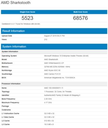 Denna “Sharktooth”-modell lyckas i Windows-versionen av Geekbench 4 kamma hem 5 523 poäng i den del av testsviten som nyttjar endast en processorkärna. Sett till delen där samtliga tillgängliga kärnor och trådar nyttjar landar poängen på 68 576. Detta kan jämföras med dagens Threadripper 2990WX som skrapar ihop 4 776 poäng i den enkeltrådade delen och 36 042 poäng i den flertrådade. Även Intels nuvarande flaggskepp Xeon W-3175X möter sin överman hos Sharktooth. Intels modell i sitt basutförande hamnar på 5 148 och 38 494 poäng i den enkeltrådade respektive flertrådade delen av testsviten.