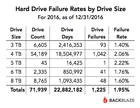 Under hela 2016 noterades 1 225 havererade diskar, 1,95 procent av samtliga installerade exemplar. Mest felbenägen var Seagate Barracuda XT 4TB (ST4000DX000), av vilka 13,57 procent av de 184 installerade exemplaren dukade under. På andra plats ligger WD Red 6TB (WD60EFRX), av vilka 5,49 procent (25 av 446 stycken) felrapporterades.