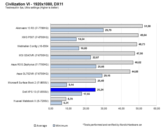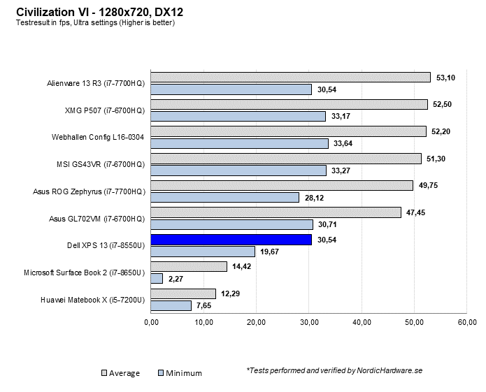 I 720p-upplösningen når XPS 13 upp till 30 FPS-gränsen men vi skulle inte kalla det för spelbart utan här behövs dedikerad grafik för att kunna njuta av spelupplevelsen.
