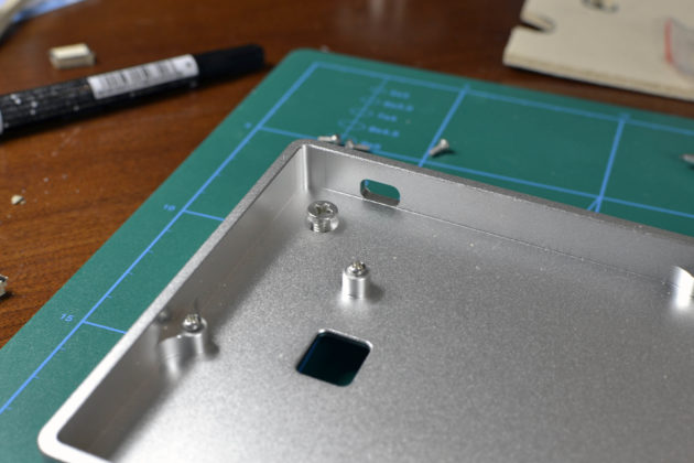 Med dämpningen tillskuren, plockar vi ur allt igen för att fästa fötterna. Chassit har ingen lutning per sin design, och vi föredrar en lutning på våra tangentbord. De medföljande fötterna är enkla att montera, rada upp dem längs med tillhörande hål och skruva i dem.