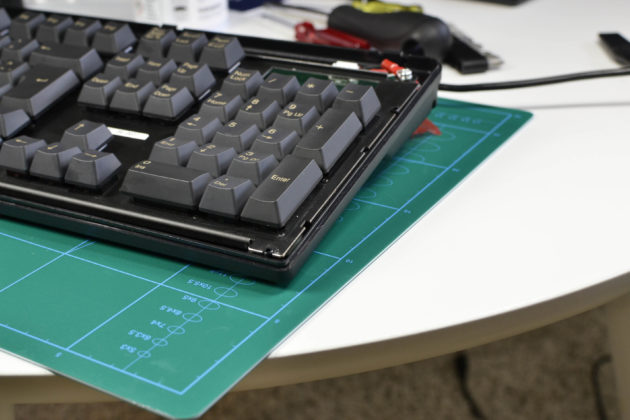 På undersidan så finns det endast två gummifötter, men märkligare än det är hur Topre har valt att lösa lutningen – det är utbuktning mot den bakre delen av tangentbordet som sträcker sig från sida till sida. Något än mer galet – chassit hålls inte ihop av skruvar, utan endast av fyra stycken plastklämmor(!) vid den främre delen.