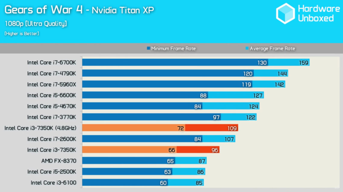 Hardware Unboxed testade sin i3-7350K tillsammans med ett GTX Titan X Pascal. En udda partner för en i3-processor, men det är genom sådana metoder som man kan se exakt hur mycket processorn blir en flaskhals för prestanda.