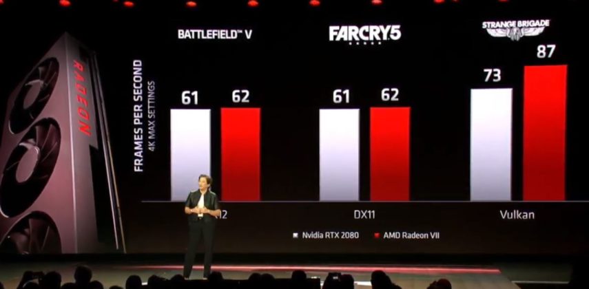 AMD demonstrerade prestandan hos Radeon VII genom att visa upp sekvenser från spel som kommande Devil May Cry 5 och The Division 2. Båda titlarna spelades i 4K-upplösning med grafikinställningarna inställda till de högsta nivåerna. Under sekvensen med Devil May Cry 5 kunde ett antal bildrutor per sekund (fps) på mellan 75 och 90 skådas. Däremot visades inga exakta siffror för The Division 2.