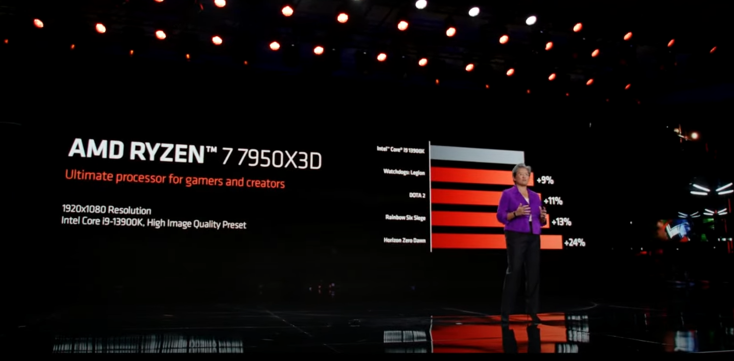 I sin presentation hävdar AMD att Ryzen 7 7800X3D kommer med mellan tio och 25 procent högre prestanda än Ryzen 7 5800X3D i utvalda speltitlar. Även Ryzen 9 7950X3D påstås ha ett ordentligt övertag i just spel där AMD hävdar en ledning på mellan nio och 24 procent jämfört med Intels Core i9-13900K. Värt att påpeka är att detta är siffror AMD själva valt ut. Opartiska recensioner får helt enkelt sätta AMD:s påståenden på prov när det väl börjar närma sig lansering.