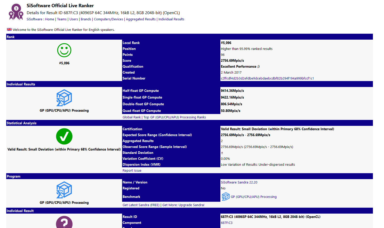 Nu har dock AMD Radeon RX Vega dykt upp i databaserna för programmen Sisoft Sandra samt Compubench. Det kort som vars testresultat har hittats i databaserna har ett så kallat Device ID 687F:C3. Tidigare när AMD har visat upp Vega så har man gjort det med ett kort vars Device ID varit 687F:C1. Detta tyder förmodligen på att det grafikkort som dykt upp i databaserna är en mer förfinad version och steget närmare slutprodukten jämfört med vad som visades upp i december 2016.