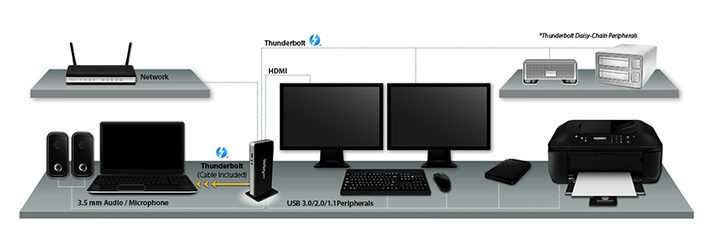 Modellen heter TBDOCKHDPBC, eller helt enkelt Thunderbolt Docking Station, och kommer med två Thunderbolt-kontakter på baksidan, för att kunna kopplas vidare i en Daisy Chain. Det finns även en HDMI-port för en bildskärm, en ethernet för trådat gigabitnätverk och dubbla USB 3.0-portar. På stationens framsida finns ytterligare en USB-port för enklare åtkomst, tillsammans med 3,5-millimetersportar för hörlurar och mikrofon.