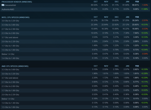 Enligt resultaten från speltjänsten Steams senaste hårdvaruundersökning har AMD på både CPU och GPU-fronten ökat i popularitet bland plattformens användare. Undersökningen visar även att Oculus Rift har börjat få upp momentum mot HTC Vive samt antalet Windows 7 som leder stort som det populäraste operativsystemet har tappar flertalet procent.