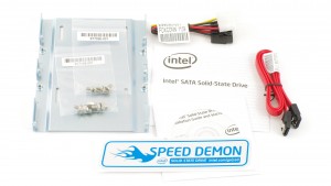 Intel brukar ha gott om tillbehör till sina SSD-enheter jämfört med konkurrenterna, så även denna gång. Förutom själva SSD-enheten så får man även med en SATA-kabel och en SATA-strömkabel, vidare får man med en manual och en skiva. Man får också med en 2,5″ -> 3,5″-adapter och denna har fått ett litet uppsving jämfört mot vad Intel tidigare skickat med. Den nya är tyngre och känns med stabil. Återigen bra tillbehör från Intel.