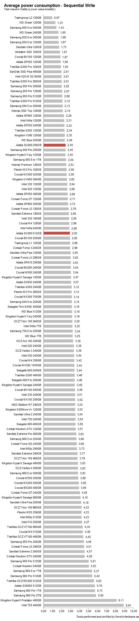 I effektivitetstesterna så såg vi att MX300 presterade riktigt bra. SU800 är inte fullt lika bra men de ger ändå dugliga siffror. Modellen på 512GB är förstås mer effektiv på grund av högre prestanda.