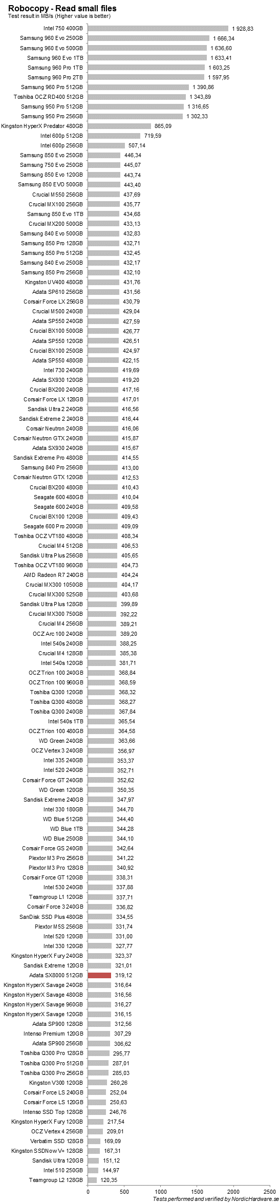 Robocopy är ett annat test som vi kört länge och här fokuserar vi på en enhets sekventiella prestanda. Vi har totalt sju stycken olika Robocopy-test. Två använder sig av stora ISO-filer, två av medelstora MP3/FLAC-filer och två använder sig av små filer som är allt ifrån HTML-filer till DLL-filer.