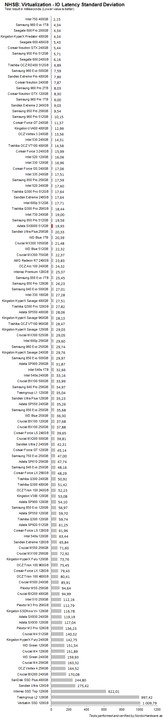 I virtualiseringstestet så fungerar det lite bättre och SX8000 klättrar upp före flera SATA-enheter igen. Dock lyckades den inte slå Seagates 3 år gamla 600 Pro 200 GB eller Kingstons HyperX Predator som fortfarande använder AHCI.