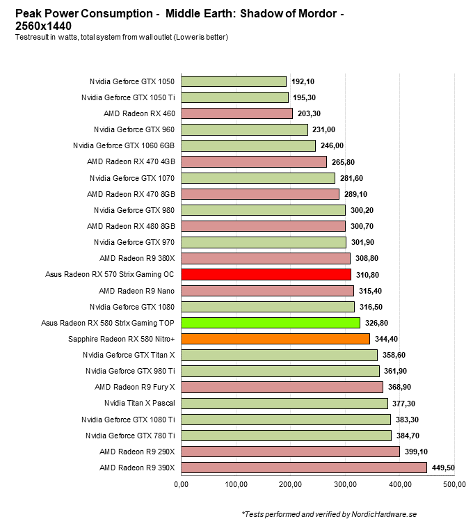 Tittar vi på den genomsnittliga effektförbrukningen under ett speltest är det dock sämre resultat. AMD har skruvat upp klockfrekvenserna och det är på bekostnad av effektförbrukningen. Radeon RX 570 drar i genomsnitt mer än fjolårets RX 480, medan RX 580 halkar efter något mer. Sapphire-kortet är sämst här, med stor sannolikhet tack vare den extra 6-pinskontakten som tillåter ett högre effekttak.