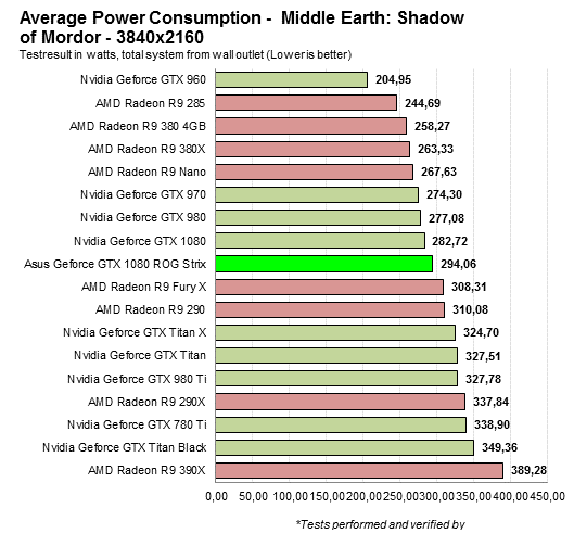 Tittar vi på den genomsnittliga effektförbrukningen i spel ser vi att även här ligger Asus-kortet lite efter referenskortet, men det är några enstaka watt som skiljer korten åt och ingen större skillnad egentligen. GTX 1080 är ett strömsnålt grafikkort trots sin prestanda.