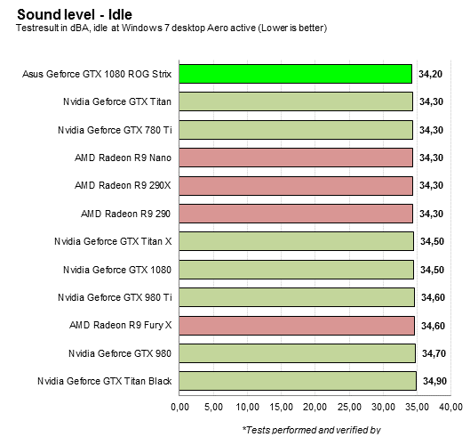 DirectCU III-kylaren är semi-passiv under en viss temperatur. Det innebär kortfattat att fläktarna på kylaren slutar snurra under en bestämd temperatur, och kyls passivt av kylflänsen. Tekniken går att stänga av i Asus egna mjukvara, men det fungerar bra och vi ser ingen anledning att göra det. I viloläge är ROG Strix tyst och det är systemets ljudnivå vi mäter, på 34,2 decibel. Under belastning stiger ljudnivån med en decibel-enheten till 35,3, vilket är rätt imponerande.