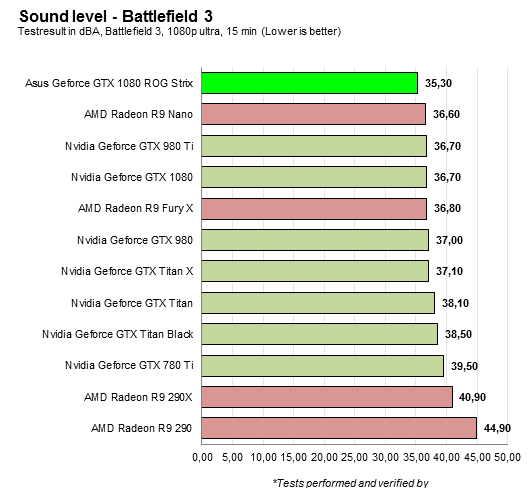 Alla grafikkort testas i ett slutet datorchassi med idel tysta komponenter där systemets ljudnivå vid vila ligger endast en halv decibel över rummets generellt låga ljudnivå. Mätningarna som utförs görs konsekvent på samma sätt och ordning.![]()