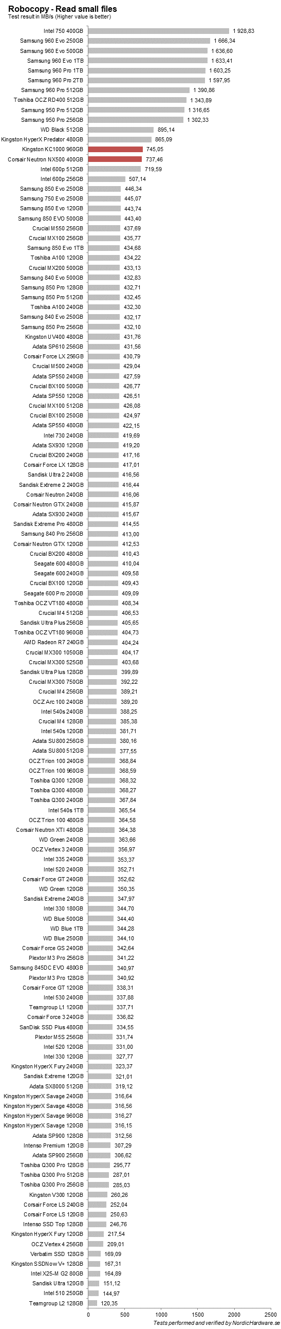 Båda enheterna är förhållandevis lika här. Vi ser dock att NX500 har en fördel med skrivning av stora filer och det beror på att KC1000 blir för varm på slutet och klockar ner sig själv en aning. Det syns dock inte i de andra testerna. Med mindre filer så tappar båda enheterna mot de närmaste konkurrenterna och tävlar snarare med de TLC-baserade PCIe-enheterna. Med större filer så presterar Phison E7 bättre och då lyckas enheterna gå både Adata SX8000 och Intel 750.