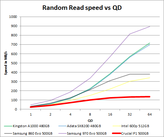 Vi kan tyvärr inte jämföra 1 TB-modellen med samma enheter som 500 GB-modellen. Det beror helt enkelt på att vi inte har testat 500 GB- och 1000 GB-modeller av alla enheter. Vi ser åter igen att P1 skalar väldigt dåligt med högre QD för slumpmässig läsning. I övrigt ligger enheten på ungefär samma nivå som Kingstons KC1000, vilket är ett bra betyg.