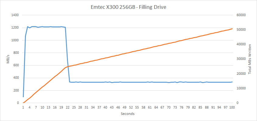 Phison använder en dynamisk SLC-cache som är ungefär 25 GB stor. Så länge det finns cache så skriver enheten i ungefär 1 200 MB/s, vilket är helt okej för en SSD på 256 GB. När cachen är slut skrivs data istället i ungefär 330 MB/s. När enheten är fylld till ungefär 220 GB, dyker skrivhastigheten ill ungefär 10 MB/s. Det är gissningsvis här enheten måste börja konvertera SLC till TLC, samtidigt som ny data ska skrivas. Phison E13 är inte en kraftfull kontroller och har väldigt svårt att göra flera saker samtidigt. Vi får helt enkelt undvika att pusha enheten så långt.