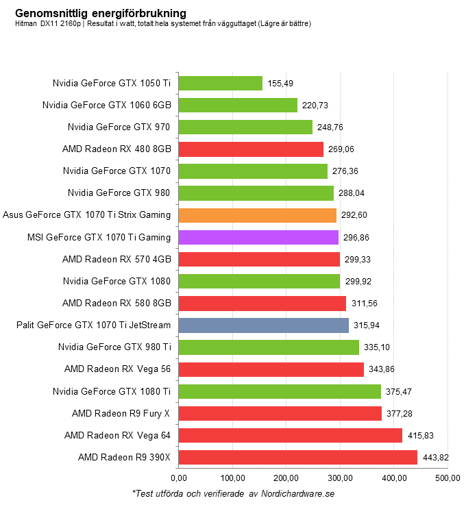 Tittar vi på den genomsnittliga effektförbrukningen under ett speltest blir det dock intressantare. Pascal dominerar här med förhållandevis låg energiförbrukning. GTX 1080 Ti och äldre GTX 980 Ti är de enda kort som springer iväg något. Jämför vi prestandamodellerna är det dock Nvidia som dominerar där vi kan konstatera att GTX 1070 Ti drar lika mycket eller faktiskt mer ström än GTX 1080. Detta beror dock med största sannolikhet mer på de partnertillverkade kortens design. Kraftfullare spänningsdelar, fler och större fläktar samt RGB-belysning och andra godsaker bygger på förbrukningen jämfört med Nvidias referensmodell av GTX 1080. Hade Nvidia skickat en referensmodell av 1070 Ti hade detta kort troligtvis lagt sig en bit under 1080, men med det sagt skenar inte förbrukningen iväg direkt ens med de partnertillverkade modellerna.