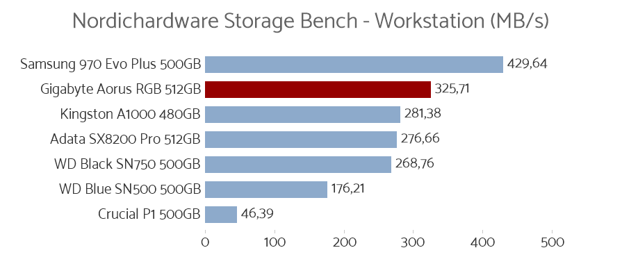 Ju tyngre arbete, desto bättre presterar enheten. I våra workstation-tester är den en av de absolut snabbaste vi någonsin testat. Den piskar WD Black, Adata SX8200 Pro och Crucial P1 rejält. Även om Aorus RGB inte är den snabbaste SSD-enheten på marknaden så levererar den tillräckligt med prestanda för såväl spelare som entusiaster och proffs.