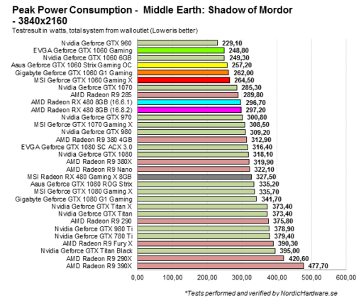 Den genomsnittliga effektförbrukningen under ett speltest med Shadow of Mordor ändrar i placeringarna från testet i viloläge. Referenskortet ligger som förväntat bra till, följt av EVGA, MSI och Gigabyte i ordning. MSI Gaming X är det mindre krävande grafikkortet i upplösningarna 1080p och 1440p, medan EVGA tar över förstaplatsen på upplösningen 4K. Gigabyte halkar lite efter vilket visar på att kylarlösningen med stor sannolikhet är lite mer krävande än konkurrenternas modeller. Resultaten är dock fortfarande bra, vilket vi ser i effektiviteten lite längre ner.