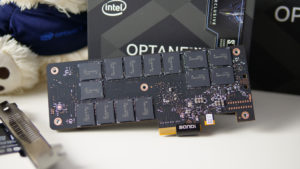 Då ska vi ta en närmare titt på minneskretsarna. På vardera sida sitter det 14 stycken minneskretsar, vilket ger oss totalt 28 stycken. Det är dock inte 28 lika dana chip, utan vi har två olika sorter. På baksidan hittar vi 14 stycken 29P16B1BLDNF3. På framsidan hittar vi 7 stycken av samma sort som på baksidan tillsammans med 7 stycken 29P32BIBMDNF3. Skillnaden mellan dessa är att den ena har en Xpoint-enhet, medans den andra har två. Eftersom varje Xpoint enhet är på 128Gbit så betyder det att varje 29P16B1BLDNF3 är på 16GB och varje 29P16B1BLDNF3 är på 32GB. Det ger oss en total kapacitet på (21×16)+(7×32)=560GB.