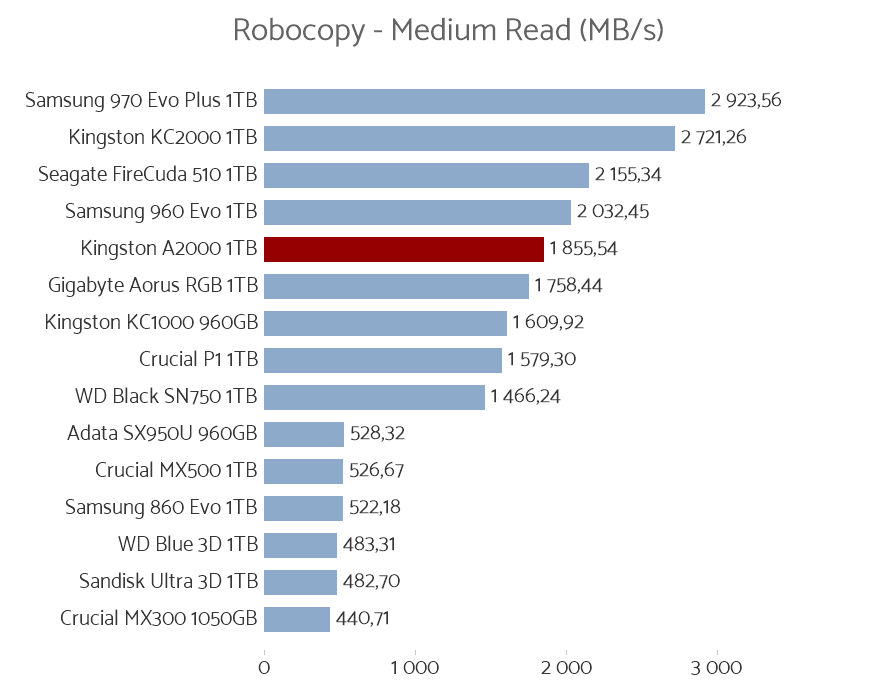 I den här storleken har vi mer high-end-enheter att jämföra med men A2000 hänger bra med ändå och lyckas slå KC1000 med bred marginal i alla tester. Crucial P1 är något snabbare trots att de båda använder samma kontroller. SATA-enheterna är långt efter då A2000 är betydligt snabbare än både Samsung 860 Evo och Crucial MX500.