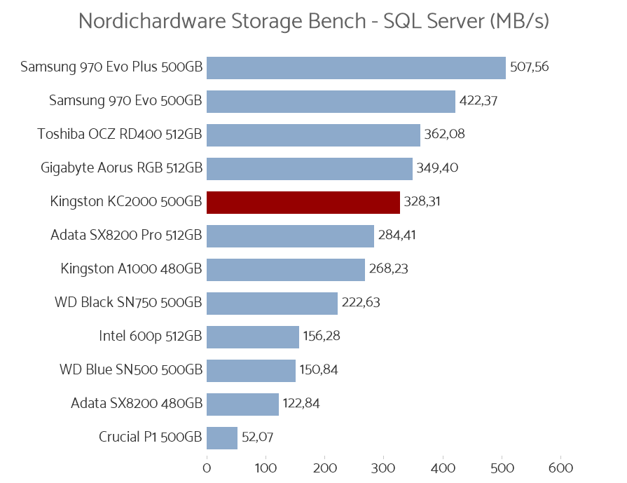 Lite tyngre belastning passar KC2000 bra och enheten är snabbare än alla närmaste konkurrenter, förutom Samsung 970 Evo Plus.