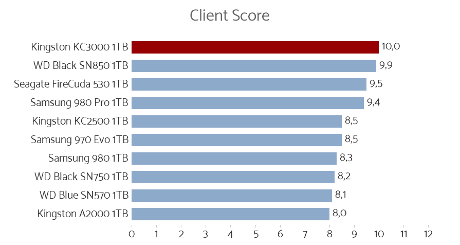 Om vi då sammanställer alla prestandaresultat och tittar på hur KC3000 står sig mot den stenhårda konkurrensen, ser det onekligen väldigt bra ut. KC3000 levererar liknande resultat som Seagate 530 2 TB gör i NHSB-Game och i Office är det bara Intels Optane som är snabbare. KC3000 slår kort sagt alla på fingrarna. Det inkluderar WD SN850, Samsung 980 Pro och Seagate Firecuda 530. I Workstation är det lite trögare och i NHSB Virtualization tappar KC3000 en del jämfört med många äldre enheter. De äldre KC2000 och KC2500 är faktiskt något snabbare i just det testet. KC3000 hämtar dock upp det i SQL Server-testet, där det bara är WD Black som är snabbare.