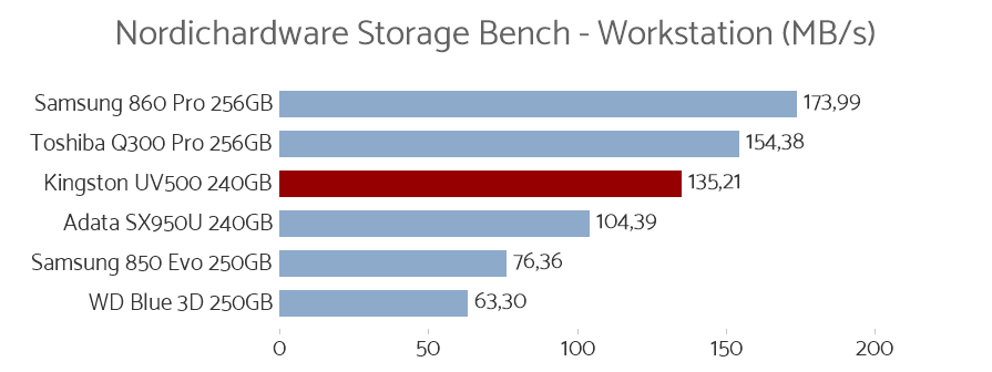 Överlag är UV500 den snabbaste SATA-enheten som Kingston har släppt, dock med ganska liten marginal. I de flesta av våra tester är Samsungs 850/860 Evo märkbart snabbare i alla scenario. Samtidigt är UV500 fortfarande något snabbare än WD Blue 3D. UV500 presterar bättre vid tyngre belastning och med riktigt hög QD (NHSB Virtualization) är UV500 riktigt snabb och presterar bättre än Samsung 860 Evo. I flera av de andra testerna är dock till och med MX300 snabbare.