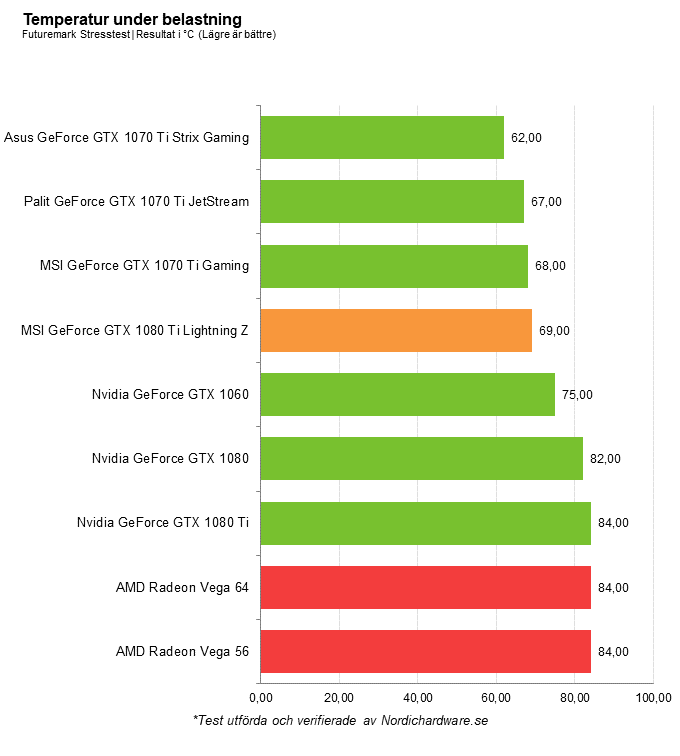 Vi kan snabbt konstatera att den kylarlösningen på det här påkostade grafikkortet håller bra temperaturer under vila och belastning. Eftersom majoriteten av de flesta nya grafikkort med eftermarknadskylare är semi-passiva varierar temperaturen under vila på grund av den passiva kylningen. Den rejäla kylarlösningen Tri-Frozr som sitter på Lightning Z håller grafikkretsen grymt sval under belastning, ungefär 15 grader svalare än referensversionen Founders Edition från Nvidia.