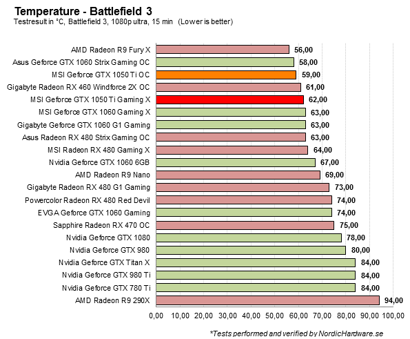 Temperaturtesterna visar på att båda grafikkorten har klart godkända kylarlösningar, där OC-modellen förvånar med bättre resultat. Gaming X är 3 grader Celsius varmare under belastning, och 9 grader varmare vid vila. Resultaten kan förklaras med att fläktarna för Gaming X inte snurrar lika snabbt samt att det är semi-passivt. OC-modellen är svalare vid vila på grund av att fläkten inte slutar snurra, vilket gör att det hinner kyla ner snabbare.