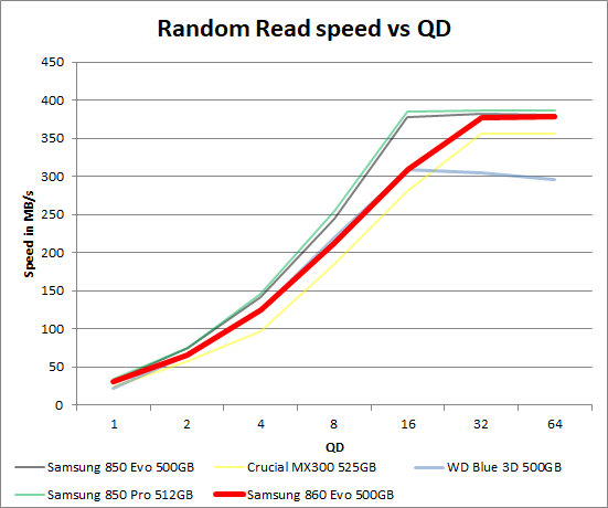 Slumpmässig läsning ser ut att vara på ungefär samma nivå som tidigare. 500GB modellen hamnar efter en aning vid högre QD och det skulle också kunna vara på grund av färre NAND-enheter.