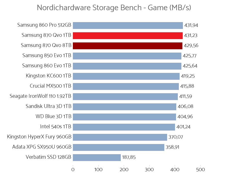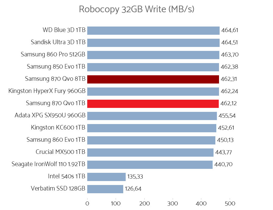 Då Qvo-serien troligtvis kommer att användas för att lagra många stora filer, är filöverföring den kanske viktigaste delen. Det positiva är att det finns gott om SLC-cache att använda så länge enheten inte är full och då rullar både läs och skriv i nästan 500 MB/s. Om du flyttar större filer finns en risk att du inte skriver till SLC och då kommer dessa enheter vara betydligt långsammare (80 resp 150 MB/s).