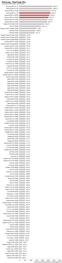 Robocopy är ett annat test som vi kört länge och här fokuserar vi på en enhets sekventiella prestanda. Vi har totalt sju stycken olika robocopy-test. Två använder sig av stora ISO filer, två av medelstora MP3/FLAC-filer och två använder sig av små filer som är allt ifrån HTML-filer till DLL-filer.