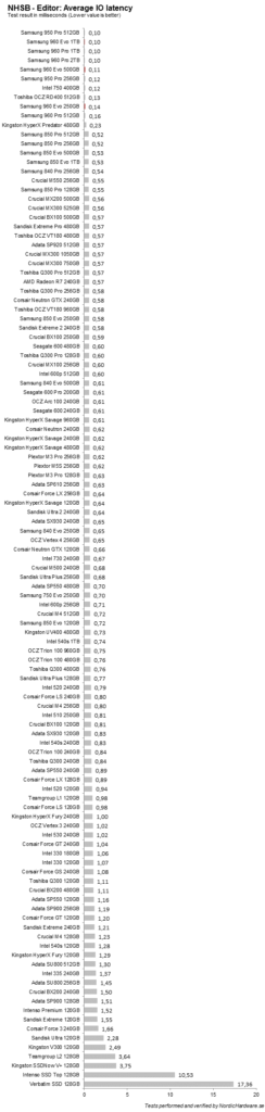 Editor-testet är ett längre test som innehåller betydligt mer data. Även om det till största delen är läsning så finns det även en betydande del skrivning som också brukar utmärka sig blanc TLC-enheter. 960 Evo klarar sig fortfarande väldigt bra, men det är sammtidigt tydligt att ett tyngre test gör att MLC-baserade enheter kommer fram. Samtliga 960 Evo enheter är långsammare än 960 Pro 512 GB i detta test. Även RD400 och den äldre 950 Pro presterar bättre. Samtidigt så är det långt ner till Intel 600p och övriga SATA-enheter.