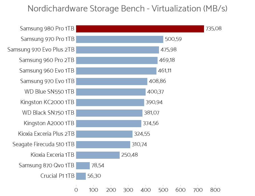 Bland 500 GB-enheter är konkurrensen hårdare och här är det primärt Intels Optane-enheter som presterar ungefär lika bra, oavsett vilken typ av belastning de utsätts för. Man ska dock komma ihåg att Optane kostar mycket mer och sitter på ett AIC. Bland vanliga M.2-enheter är det 980 Pro som är snabbast. Återigen väldigt imponerande filöverföringsprestanda. Jämfört med första generationens PCIe 4.0-enheter (Gigabyte Aourus Gen4) är det som natt och dag. Samsung sätter helt klart en ny ribba för vilken prestanda man kan uppnå med en ensam SSD.