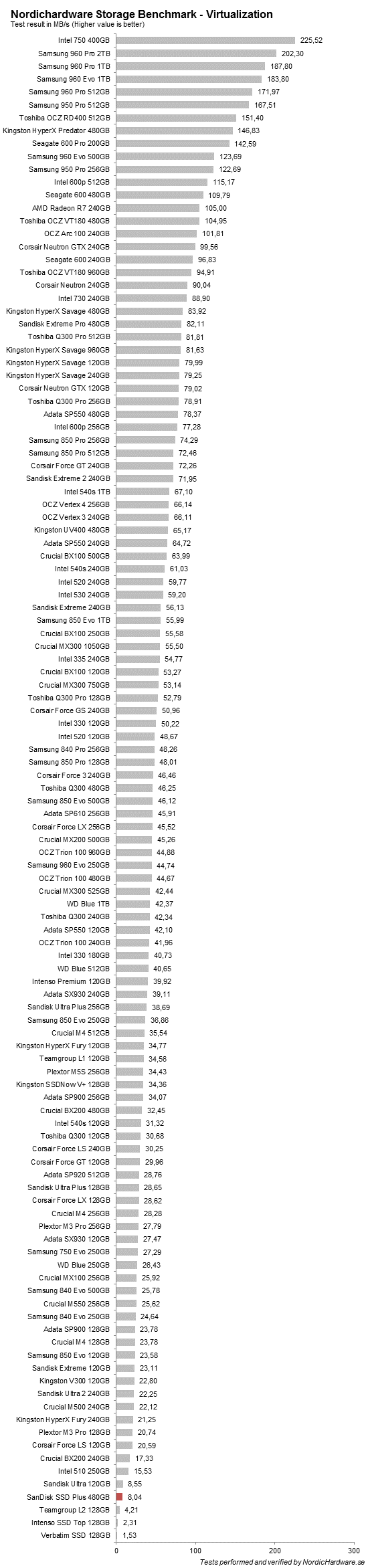 Om resultatet var illa i våra klient-tester, ja då är de katastrofala när belastningen ökar ännu mer. I våra workstation tester så är Sandisk SSD Plus långsammare än Sandisk Ultra 120GB. Det är en SSD som använde första generationen Sandforce-kontroller och SATA 3Gbps. Då är vi nästan nere på hårddisknivåer.