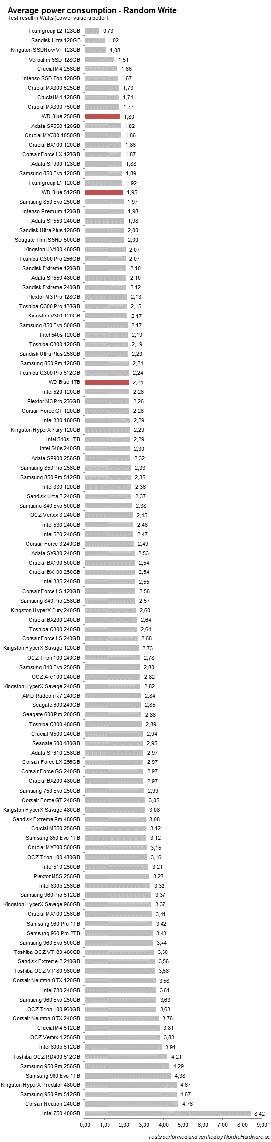 När vi testade MX300 så upptäckte vi att Marvells 88SS1074 är en väldigt effektiv kontroller. Låg strömförbrukning i vila kommer av att enheten har stöd för HIPM/DIPM och kombinerar man det med låg förbrukning under belastning så får vi enhet som har hög effektivitet. Vi ser i Office och Virtualization att WD Blue är mer effektiv än MX300 och även Samsungs 850 Evo.