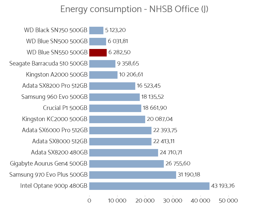 Under belastning ser vi däremot att även SN550 drar väldigt lite ström. 500 GB-modellen ligger särskilt bra till. Det skulle kunna vara så att det primärt är NAND-kretsen som drar ström.