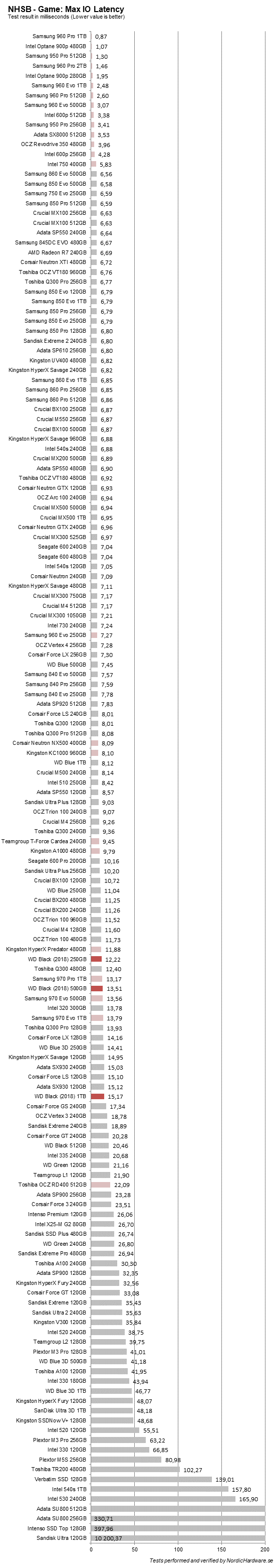 Då speltestet är väldigt läs-intensivt så ser vi alla tre modellerna ligger på ungefär samma nivå. Även om WD Black inte lyckas ta sig upp till toppen av listan så ser är alla modeller där uppe i toppen bland Samsungs 960/970 enheter. Något som bara Intels Optane 900p och Toshibas RD400 lyckats med tidigare. Och då ska man komma ihåg att de enheterna använder MLC-Nand/3D Xpoint. Det är ett ordentligt kliv framåt jämfört med förra året när Samsung var helt ohotade.