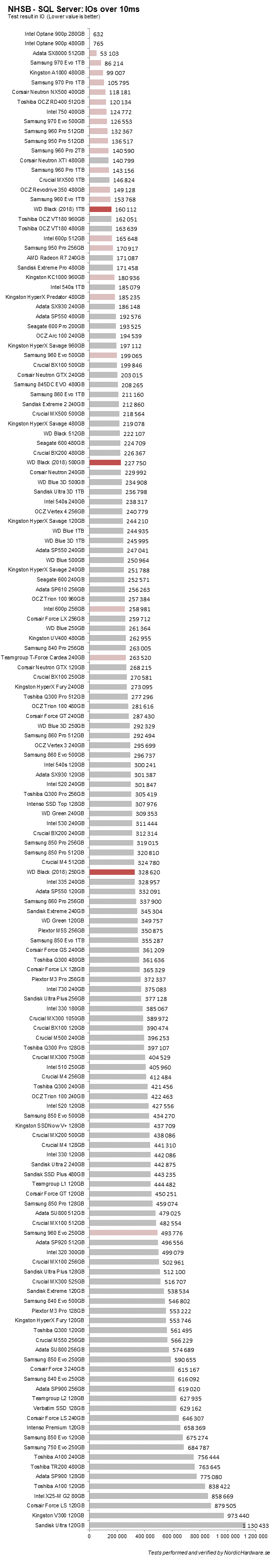 Det sista NHSB-testet är det vi kallar Virtualization. Det här är det överlägset tyngsta testet som vi har i vår testsvit och billigare enheter tappar ofta luften totalt. Det här testet är inspelat på en Hyper-V server som kör totalt 6 stycken virtuella maskiner som dessutom har lite för lite RAM-minne (vilket gör att en del måste cachas till disk istället, vilket ökar belastningen). Det här är också det test som har överlägset högst QD, vilket borde gynna NVMe-enheter och enterprise-enheter. NHSB-Virtualization skriver 166 GB och läser 181 GB.